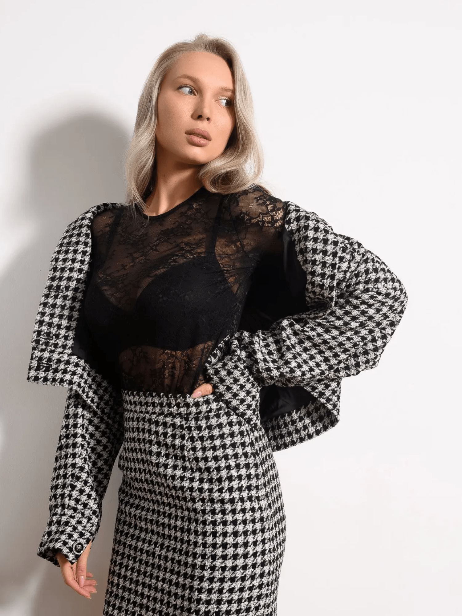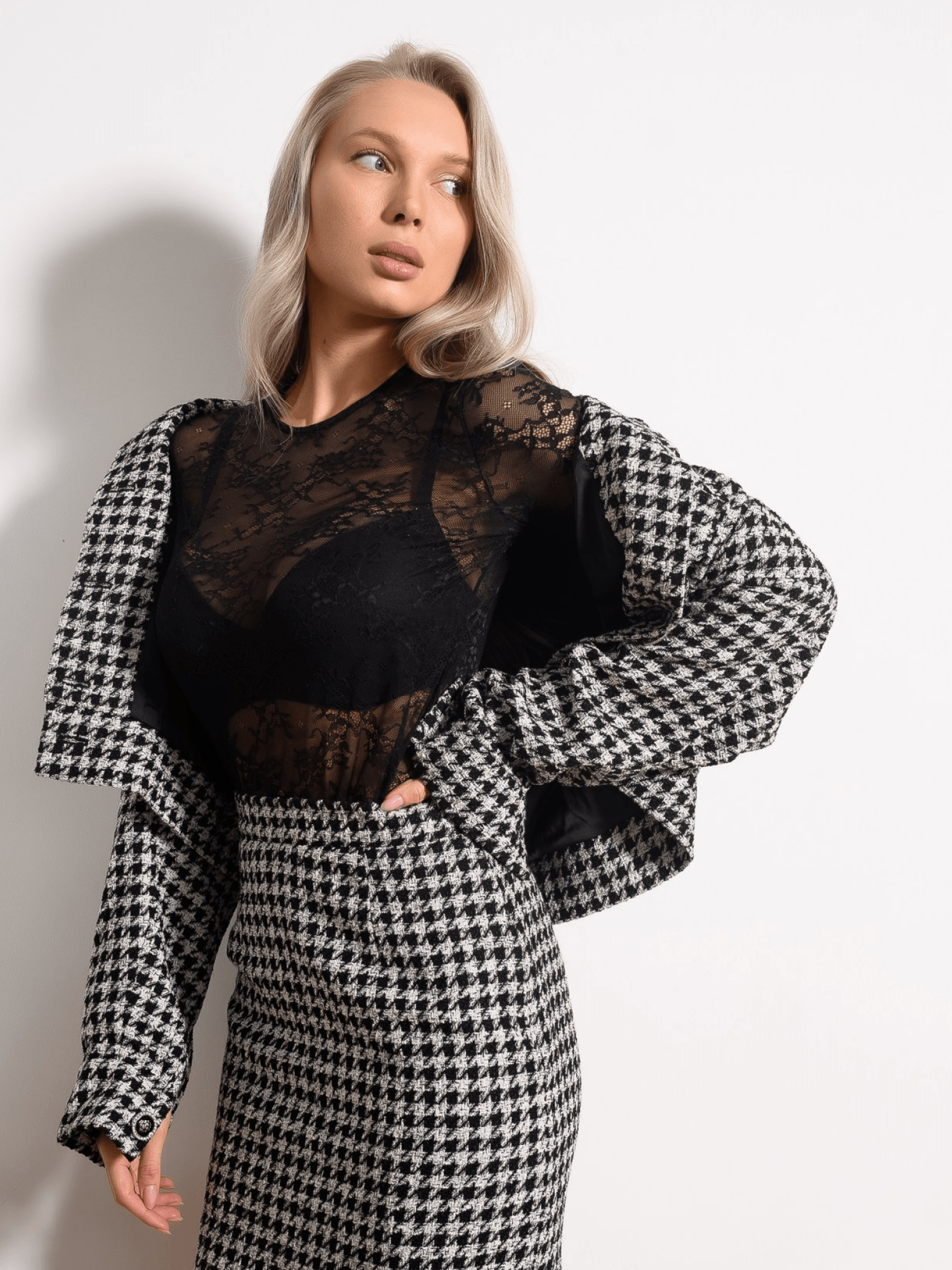 Юбка рассчитана на парную носку с жакетом из той же ткани и как самостоятельная вещь — с базовым трикотажем, блузами, шёлковыми топами.