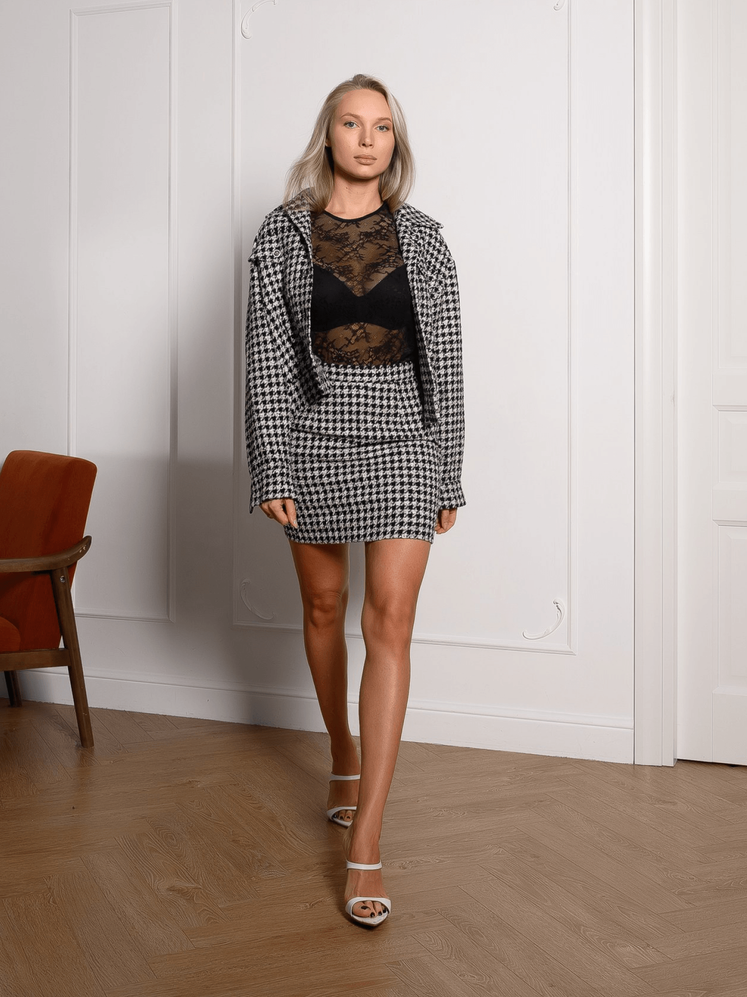 Прямая юбка-мини из фактурного твида с принтом «гусиная лапка».